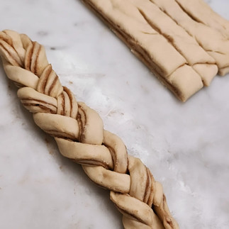Cut the dough into even strips of about 5 cm. Then split each strip in three leaving the top joined together. Hold the joined part still and make a braid with the loose ends. Then roll up into a ball.